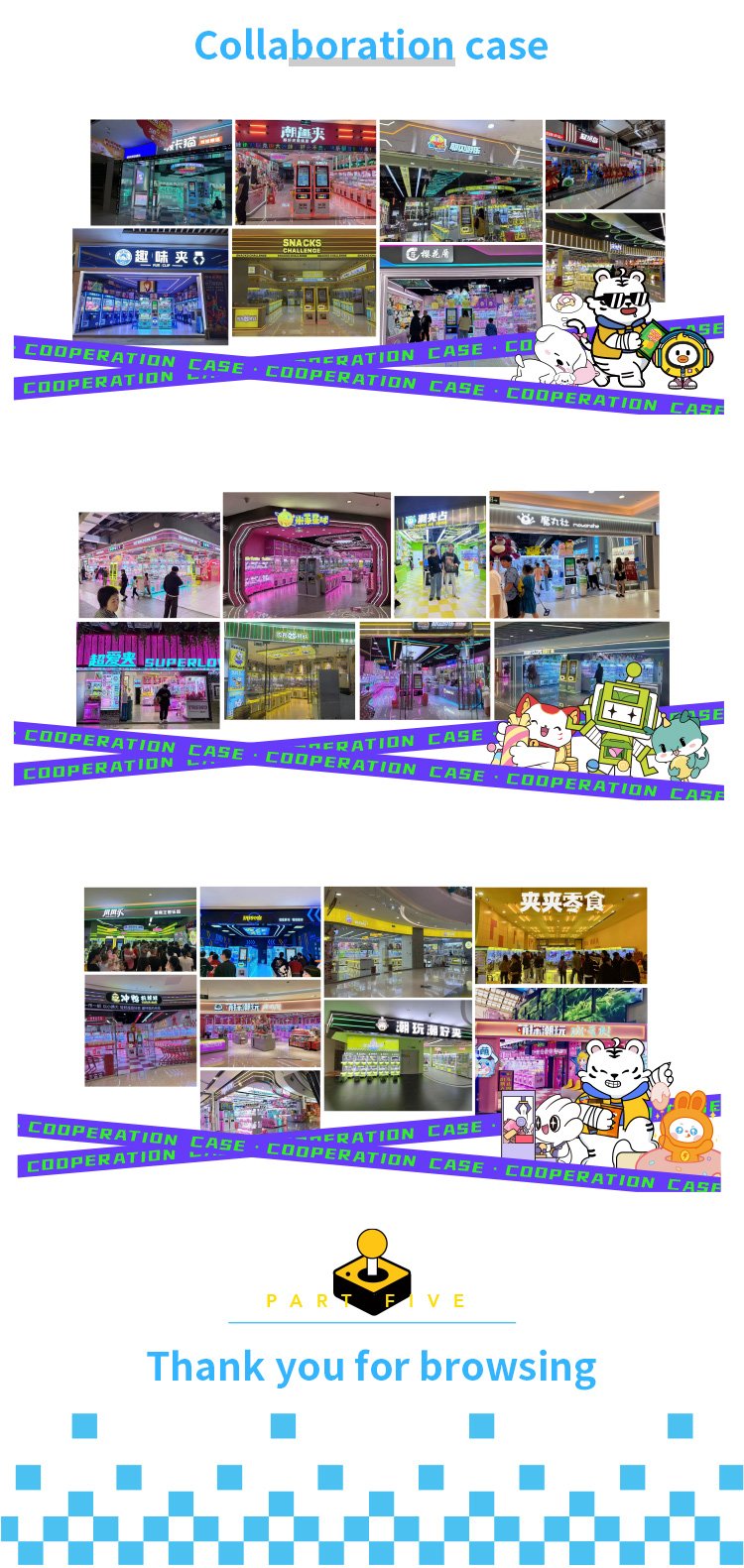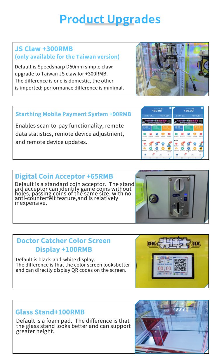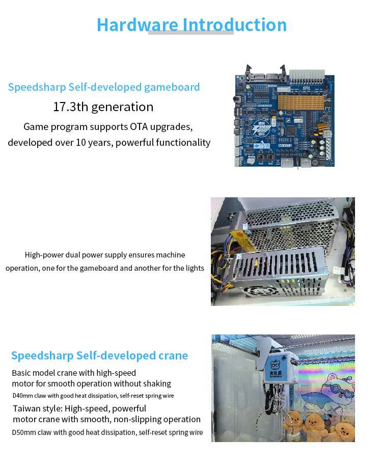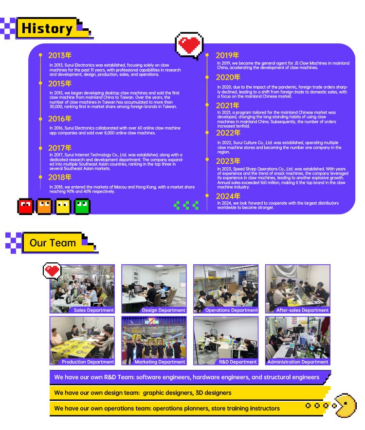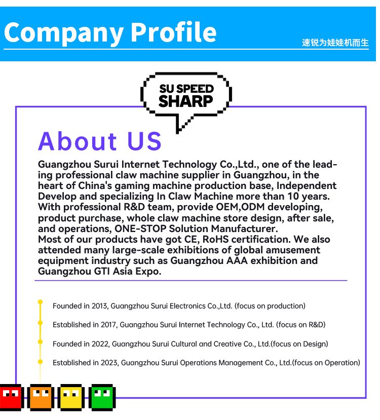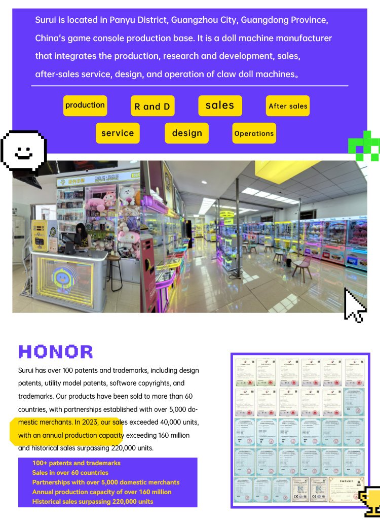 Guangzhou Su Rui Network Technology Co., Ltd. is one of the leading professional claw machine suppliers in Guangzhou. It is located in the center of China's game machine production base. It has independently developed and focused on claw machines for more than ten years. The company has a professional R&D team and provides one-stop solutions such as OEM, ODM development, product procurement, claw machine store design, after-sales and operation. Most of the company's products have obtained CE, RoHS, CE, CB, PSE and other certifications. The company has also participated in large-scale exhibitions in the global amusement equipment industry many times, such as Guangzhou AAA Exhibition and Guangzhou GTI Asia Expo.